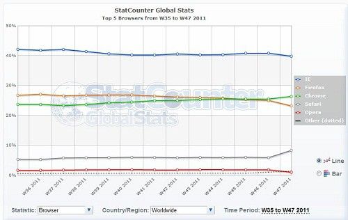 Der Internetgigant Google hatte im Vergleich zu seinen Konkurrenten ziemlich spät mit der Entwicklung eines Browsers angefangen, doch er hat schnell aufgeholt. Vor zwei Jahren konnte Google gerade mal einen Marktanteil von nur 4,66 Prozent erobern. Inzwischen hat der Abstand zwischen IE und Chrome aber stark abgenommen. Nach Einschätzung der Marktforscher werde diese Tendenz weiter anhalten. Im Januar oder Februar kommenden Jahres soll der Marktanteil von IE nicht mehr über 40 Prozent liegen.