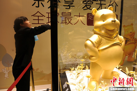 - In der südwestchinesischen Stadt Chengdu hat ein Winnie Pooh-Bär aus 16,8 Kilogramm Reingold viele Besucher angezogen. Der goldene Bär besteht aus dünn ausgewalztem Feingold und ist 113 Zentimeter groß – und das Gold hat bereits einen Marktwert von über 6 Millionen Yuan (720.000 Euro).