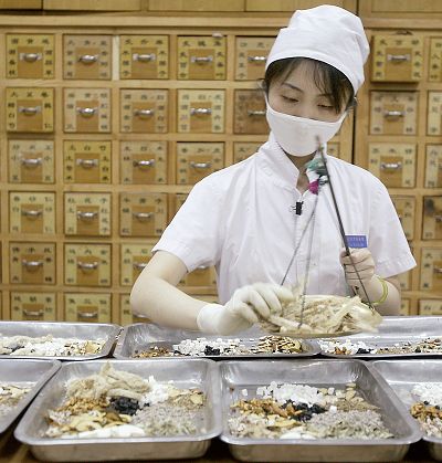 Ein Mitarbeiter einer chinesischen Apotheke bereitet Kräuter im Beijinger Krankenhaus für Traditionelle Chinesische Medizin im Bezirk Dongcheng vor. (Archivfoto, 23. Juli 2009).
