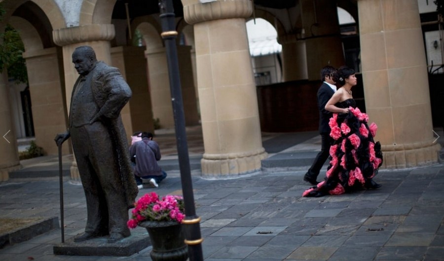 Ein Brautpaar geht an der Statue von Winston Churchill in der Thames Town vorbei – nicht in Großbritannien, sondern in Shanghai, Ostchina.