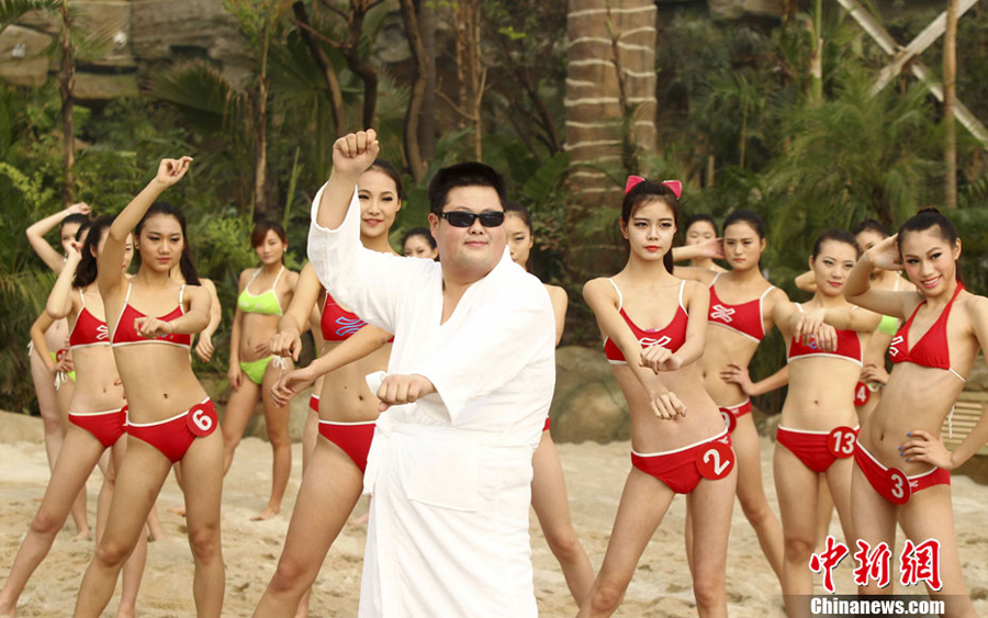 40 Kandidatinnen eines chinesischen Schönheitswettbewerbs tanzten gemeinsam in heißen Bikinis den weltbekannte Gangnam-Style in Jiaozuo, der Provinz Henan in Zentralchina.