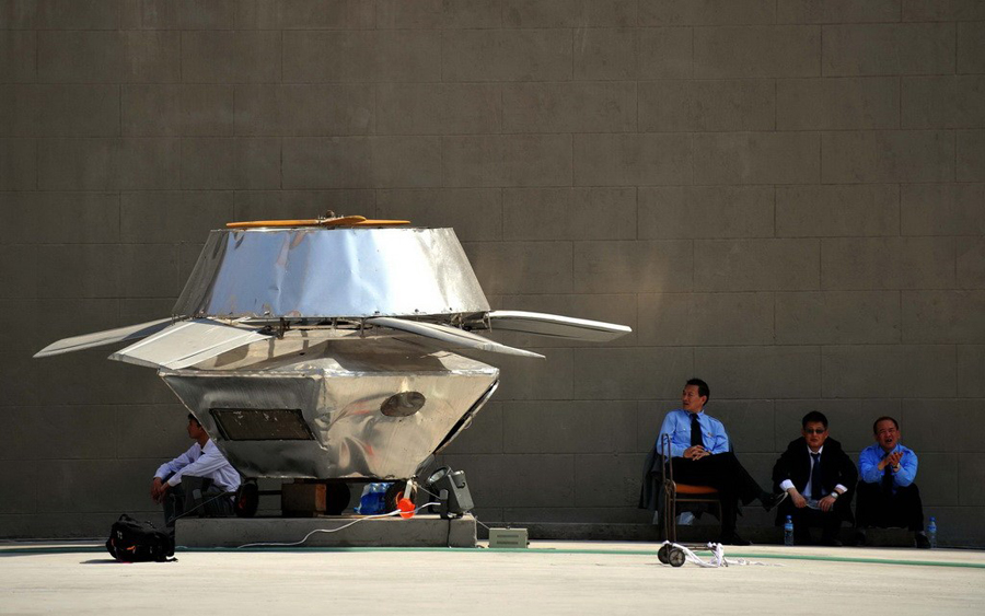 2. Mai, 2010. Wieder ein UFO. Die von Du Wenda gebaute Flugmaschine landet vor der Tür eines Kunstmuseums in Shanghai.