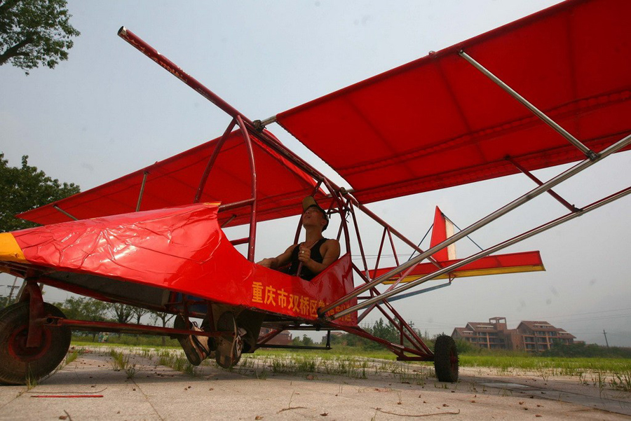 19. September, 2010. Der 24-jährige Chongqinger Zeng Qiang und ein von ihm selbst hergestelltes Flugzeug.