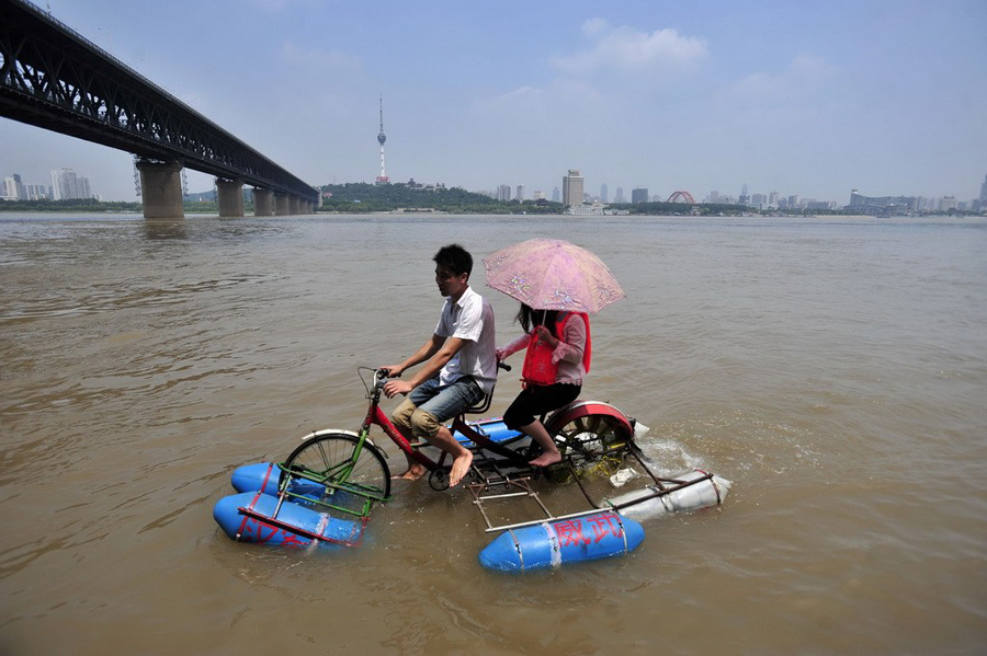 29. Juni, 2011. Xiao Lei und seine Freundin fahren gemeinsam mit einem „amphibischen Tandem“ auf dem Fluß Yangtse. Das Gerät wurde von Li Weiguo, dem Lehrer von Xiaolei erfunden.