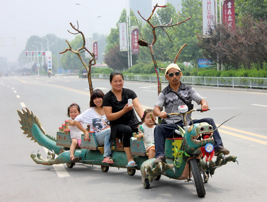 15. August, 2012. Stadtbürger von Zhoukou, Provinz Henan, probieren voller Freude den „Drachenwagen“, der aus einem Motorrad umgebaut wurde.
