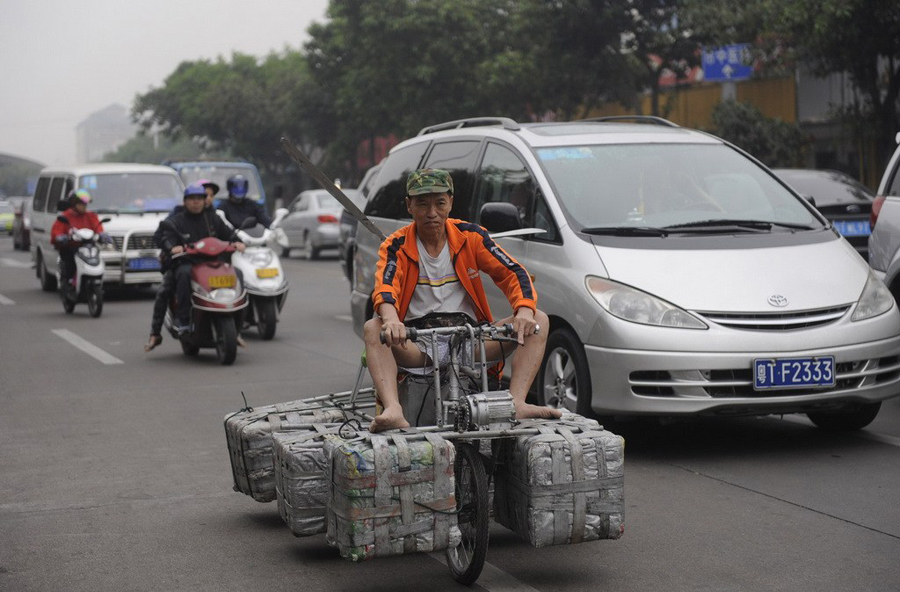 3. März, 2013. Der 66-jährige Li fährt mit seinem amphibischen Fahrrad in Zhongshan, Provinz Guangdong.