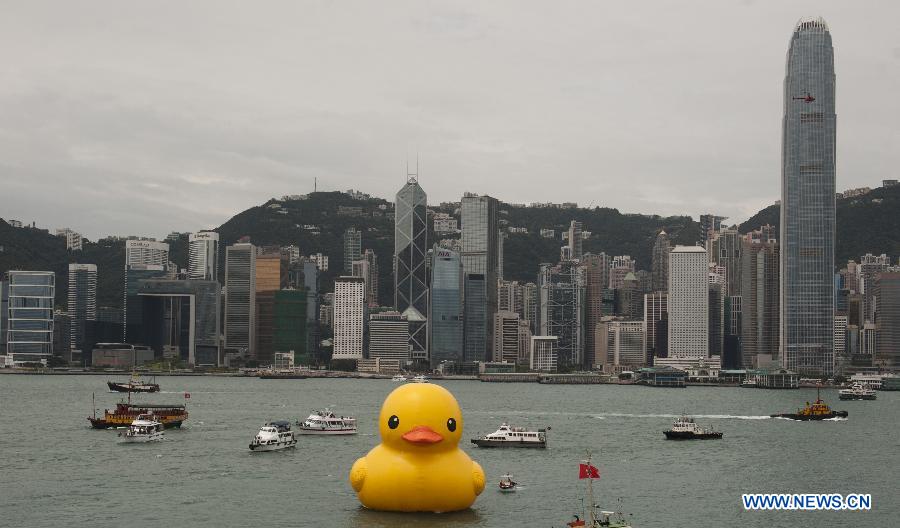 Eine riesige Gummiente schwimmt auf dem Wasser im Victoria-Hafen in Hongkong, Südchina, 2. Mai 2013. Erschaffer der großen Gummiente ist der niederländische Künstler Florentijn Hofman. Sie ist 18 Meter lang und 15 Meter breit und hoch. Seit 2007 wurde die Ente in zwölf Städten aufgestellt. [Xinhua]