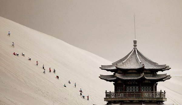 Der Sandabhang in Jiuquan, Gansu, zieht zahlreiche Touristen an.