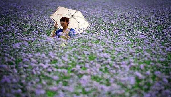 Eine Frau posiert in einem Blumenmeer vor der Kamera.