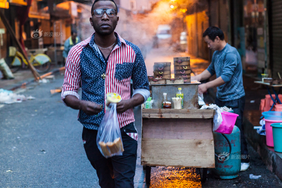 Ein afrikanischer Student kauft sein Frühstück bei einem Händler in der Baohanzhi Straße. Die Straße ist in der Regel vormittags ruhig, wenn in anderen Teilen der Stadt Horden von Menschen zur Arbeit oder Schule eilen. Die Bewohner dieser Straße leben ein völlig anderes Leben.