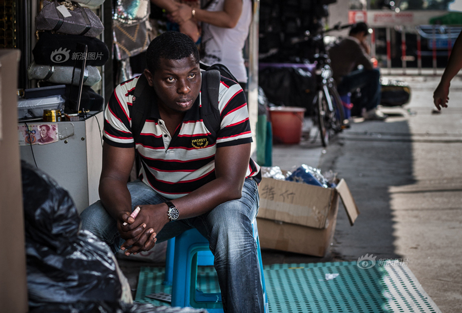 Ein afrikanischer Mann kauft im Ledergroßmarkt "Guihuagang" ein. Viele Afrikaner der Baohanzhi Straße importieren Ware aus Guangzhou zu ihren Geschäften in ihrer Heimat. Einige von ihnen haben Filialen in Guangzhou eröffnet.