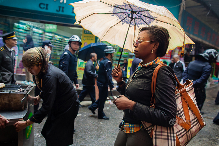 Polizisten mit Helmen patrouillieren die Straße. Sie sprechen oft mit Händlern, die zu viel Raum für sich beanspruchen.