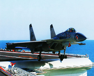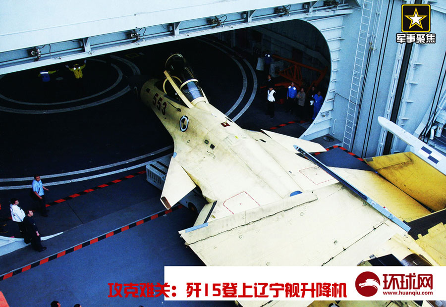 In einem Flugzeugträger finden fast 100 Kampfjets Platz, die allerdings nicht alle auf dem Deck stehen können. Eine gewisse Anzahl wird stets in den Hangars unter Deck aufbewahrt. Deswegen braucht es eine spezielle Hebebühne, um die Jäger zwischen den beiden Ebenen zu transportierten. Dieses Foto zeigt einen J-15, der auf der Hebebühne getestet wird. Dieser geglückte Versuch steht für einen weiteren Durchbruch in der chinesischen Technologie der Flugzeugträger.