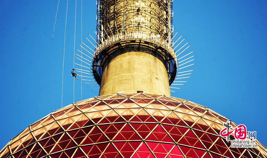 Am Montag haben die Reinigungsarbeiten für den Oriental Pearl Tower in Shanghai begonnen. Seit der Fertigstellung im Jahr 1994 war der Fernsehturm ständig den äußeren Umweltbedingungen ausgesetzt. Durch Wind und Wetter sind die leichtgrünen Säulen schon gelb und grau geworden. Dabei geht die ursprüngliche Wirkung des Turms wegen des gesprenkelten Aussehens mehr und mehr verloren. Um der Verwitterung und Korrosion zu entgegnen, soll nun die Betonaußenseite des Turm gereinigt und renoviert werden. Dem Plan zufolge sollen die Reinigungsarbeiten vor dem Mai 2014 vollendet werden. Während dieser Zeit ist der Turm nach wie vor offen für die Touristen.