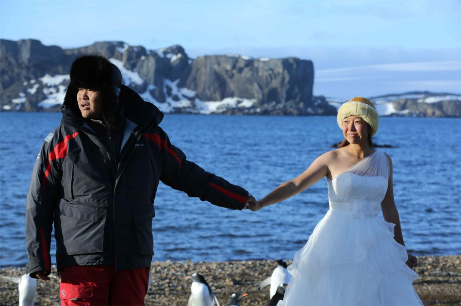 Nach achtmonatigem Segeln erreichte das Beijinger Paar am Dienstag am Südpol und gaben sich auf dem Eiswelt das Jawort. Die Familien der Ehegatten, Zhang Xinyu und Liang Hong, sahen ihre Hochzeit live online. Sie sind das erste chinesische Paar, das sich am Südpol heiraten.