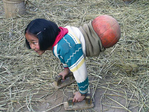 Qian Hongyan "läuft" auf ihren Händen -- dafür braucht sie zwei Holzblöcke und einen Basketball, der verwendet wird, um ihre Beinstümpfe und den Unterleib zu bedecken.