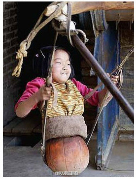 Qian Hongyan spielt auf einer Schaukel.