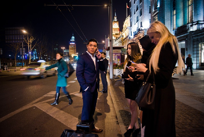 Ein junger chinesischer Unternehmer wartet mit seinen ausländischen Freundinnen auf die Wagen.