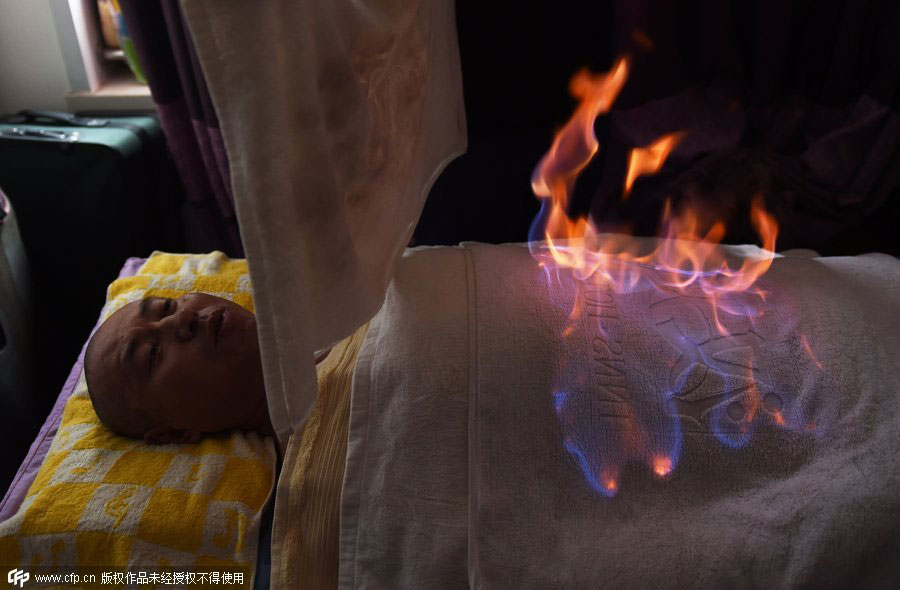 Das Foto vom 17. Juni 2014 zeigt einen Mann, der sich in Beijing einer "Feuertherapie" unterzieht. Ein Therapeut gießt Alkohol über einen mit Tüchern und Plastikfolie bedeckten Patienten und zündet den Alkohol an. Für einige Chinesen gilt diese Praktik als Behandlung von Krankheiten.