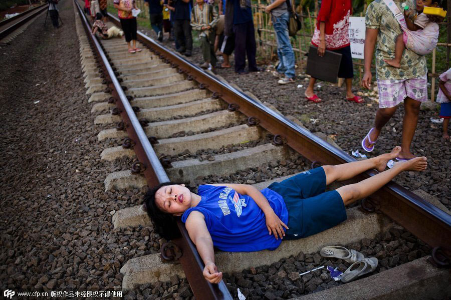 Indonesier liegen an der Station Rawa Buaya in Cengkareng im indonesischen Jakarta auf elektrischen Schienen, um sich einer "Stromtherapie" zu unterziehen (Foto vom 23. Juli 2011). Den dort lebenden Menschen zufolge kann die Therapie Krankheiten vorbeugen und andere gesundheitliche Vorteile bringen.