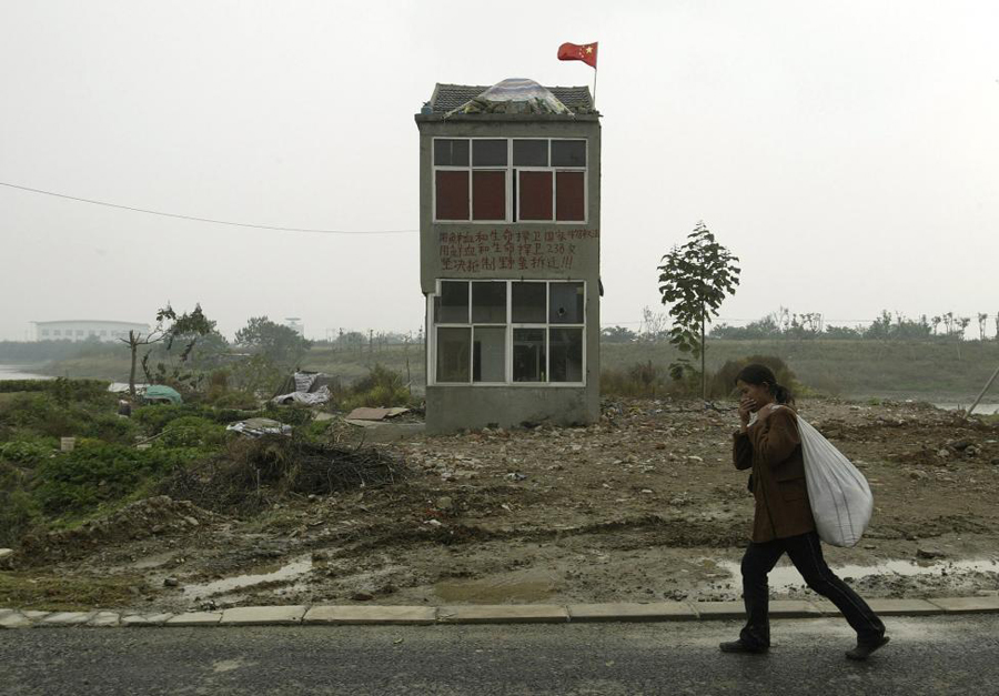 Eine Frau geht an einem Nagelhaus in Nanjing vorbei, der Hauptstadt der ostchinesischen Provinz Jiangsu. Auf der Wand des Hauses steht geschrieben: Entscheidung, sich gegen barbarische Gewaltabrisse zu wehren.