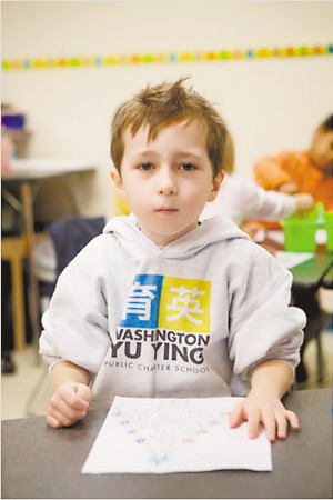 Ein amerikanischer Grundschüler lernt Chinesisch.
