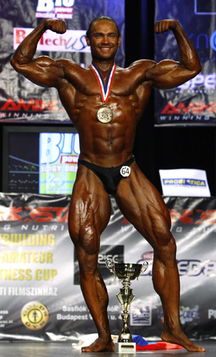 Igor Gostiunin aus Russland lässt sich fotografieren, nachdem er den ersten Platz im Bodybuilding der Männer in der Kategorie über 180 cm und den ersten Platz im Bodybuilding der Männer in der Gesamtkategorie bei den Amateur-Bodybuilding-Weltmeisterschaften der Männer in Budapest belegt hat (Foto vom 21. November 2010). [Xinhua/Reuters]