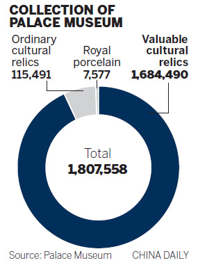 Das Palastmuseum hat in seiner Sammlung insgesamt 1.807.558 Exponate, wie die Museumsleitung am Mittwoch bekannt gab. "Dies ist das erste Mal seit seiner Gründung am 10. Oktober 1925, dass eine so genaue Untersuchung der Schätze des Museums durchgeführt wurde", sagte Chen Lihua, Vize-Leiterin des Museums. Sie hat das Untersuchungsteam geleitet, welches im Jahre 2004 gegründet worden war. In der Sammlung gebe es 1.684.490 Stücke, welche als wertvolle Kulturrelikte gelten und deswegen unter staatlichem Schutz stehen. 115.491 Exponate seien normale Kulturrelikte und 7577 Stücke seien Beispiele für kaiserliches Porzellan, sagte Lou Wei, Direktor des Departments für Kulturrelikte des Museums.