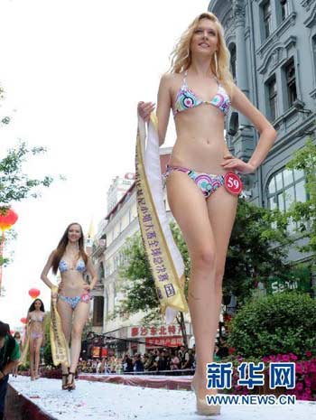 Eine Kandidatin posiert in Bikini auf dem Laufsteg in der Hauptstraße Harbins. (Foto von Li Qian, DBW.cn)
