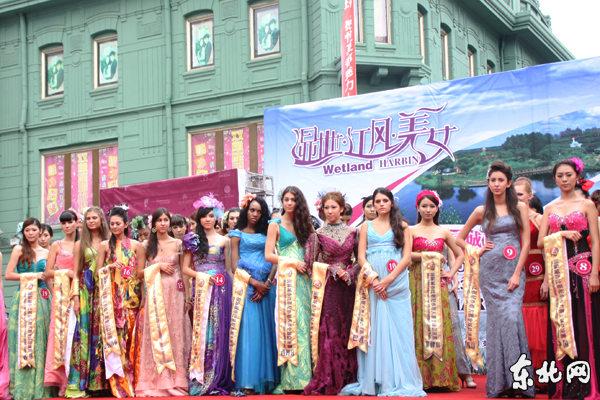 Die Kandidatinnen posieren in Abendkleidung in der Hauptstraße Harbins. (Foto von Li Qian, DBW.cn)