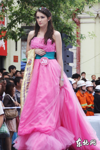 Eine Kandidatin posiert in Abendkleidung auf dem Laufsteg in der Hauptstraße Harbins. (Foto von Li Qian, DBW.cn)