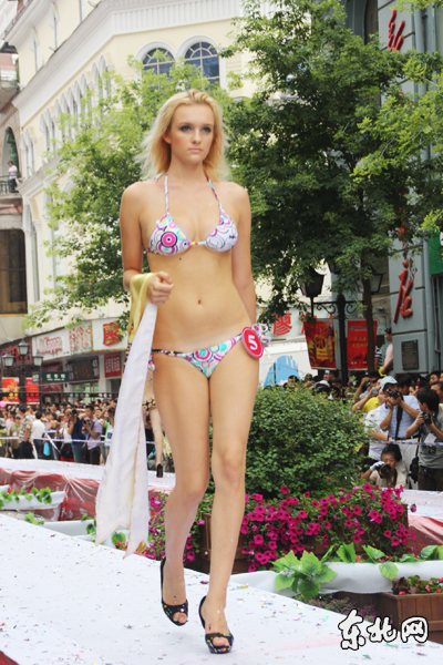 Eine Kandidatin posiert in Bikini auf dem Laufsteg in der Hauptstraße Harbins. (Foto von Li Qian, DBW.cn)