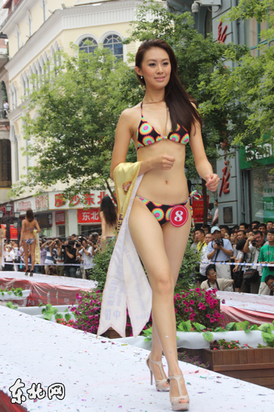 Eine Kandidatin posiert in Bikini auf dem Laufsteg in der Hauptstraße Harbins. (Foto von Li Qian, DBW.cn)