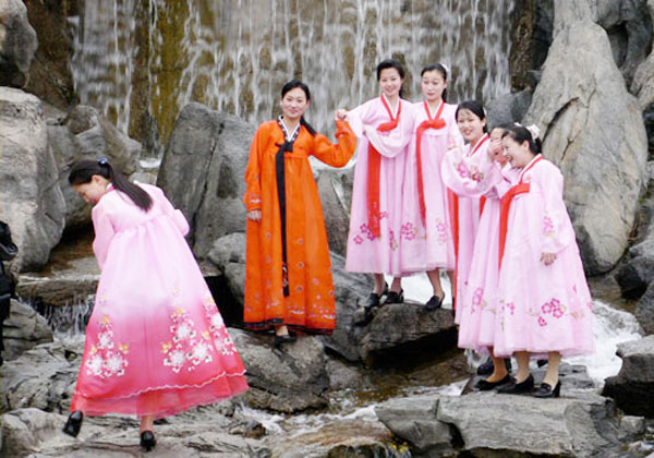 Nordkoreanische Frauen machen in traditionellen Kleidern im Pjöngjanger Fountain Park Fotos.