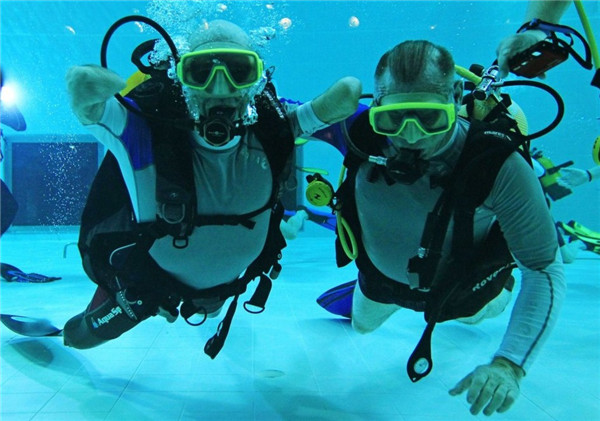 Am 10. Januar 2013 tauchte Philippe Croizon (links) aus Frankreich beim Wasserspringen in Brüssel bis zu einer Tiefe von 33 Metern.