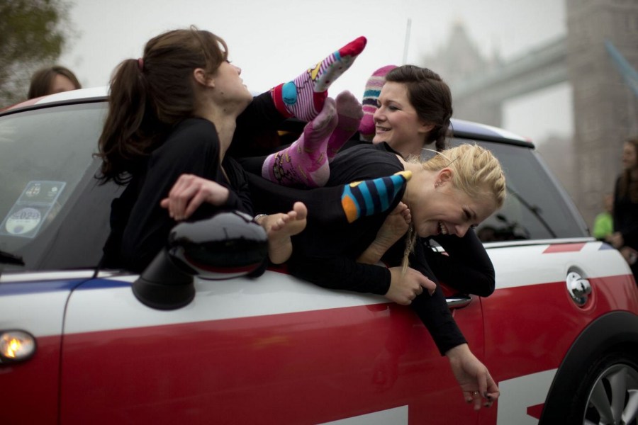28 Frauen drängen sich in ein Mini-Auto. Im Bild warten sie auf eine Fotoaufnahme der Medien.