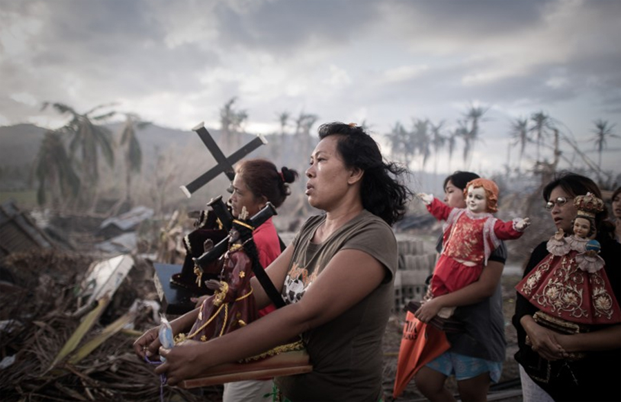 Phillipe Lopez: 1. Preis (Kategorie Spot News Single). Zerstörung und Trauer: Das Bild des französischen Fotografen Phillipe Lopez zeigt Überlebende des Taifuns Haiyan, die auf der Insel Leyte auf den Philippinen in einer religiösen Prozession durch die verwüstete Landschaft ziehen.
