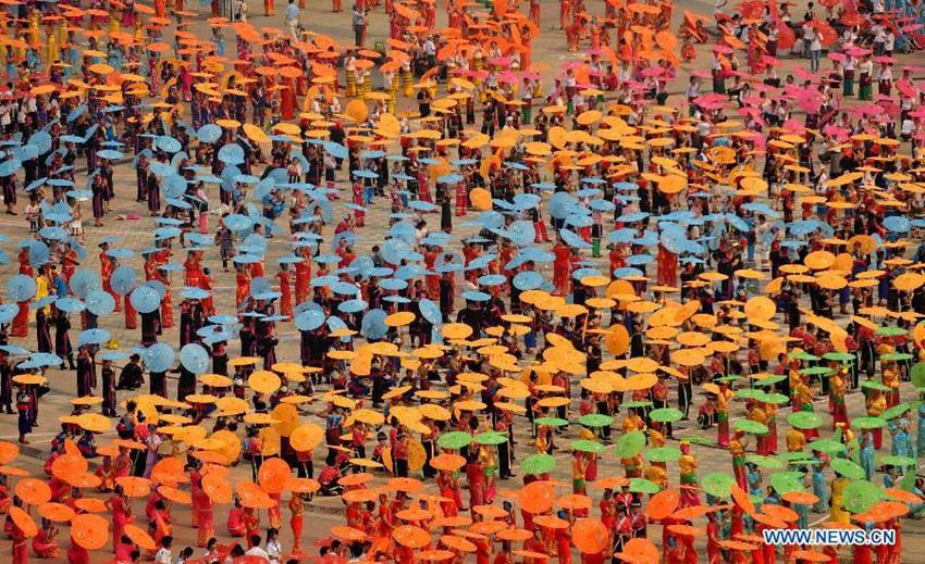 Am 14. April tanzten die Menschen der Dai-Minderheit in der Stadt Jinghong, die sich in der südwestchinesischen Provinz Yunnan befindet, bei einer Veranstaltung einen traditionellen Dai-Tanz, bei denen Papierschirme verwendet werden.