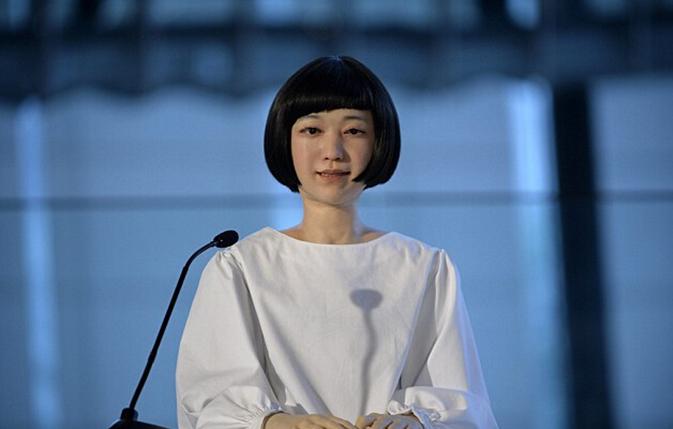 Der Android-Roboter Kodomoroid spricht am 24. Juni 2014 auf einer Pressekonferenz im National Museum of Emerging Science and Innovation in Tokio. Die neuesten Kreationen des japanischen Android-Experten Hiroshi Ishiguro sind die Roboter-Ansagerin Otonaroid, ein Mädchen-Roboter namens Kodomoroid und Telenoid, eine haarlose Schaufensterpuppe zum Umarmen. Kodomoroid kann Nachrichten vorlesen, ohne einmal zu stottern. Es ist weltweit der erste Ansager-Roboter auf der Basis des Android-Systems.