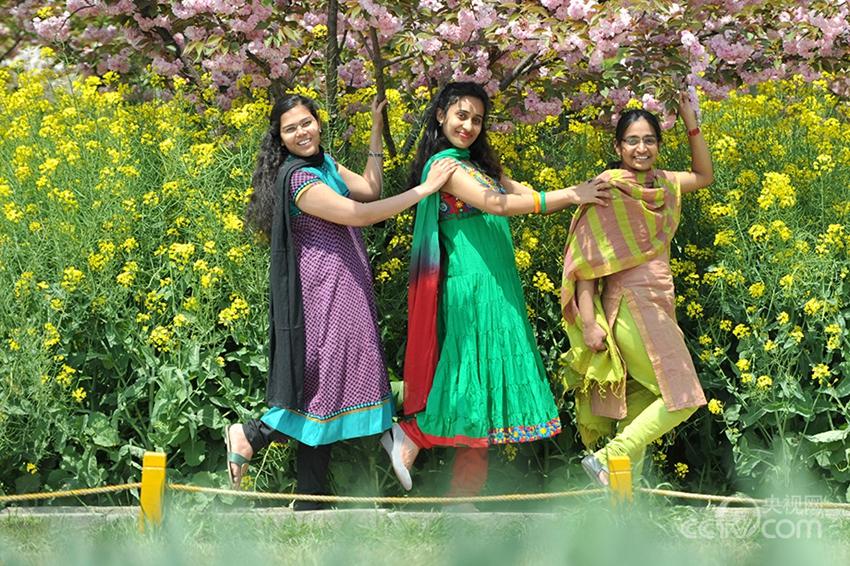 Drei indische Studentinnen posieren in einem Park in der ostchinesischen Stadt Nanjing für Fotos (Foto vom 11. April 2013).