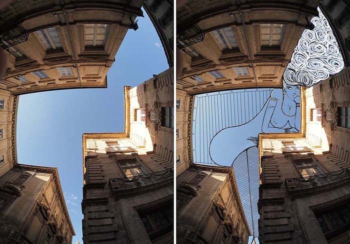 Der französische Künstler Thomas interessiert sich für Fotos von städtischer Architektur. Anhand dieser Fotos hat er eine neue Art von Kunst geschaffen. Er malt also mit dem Himmel als Leinwand.