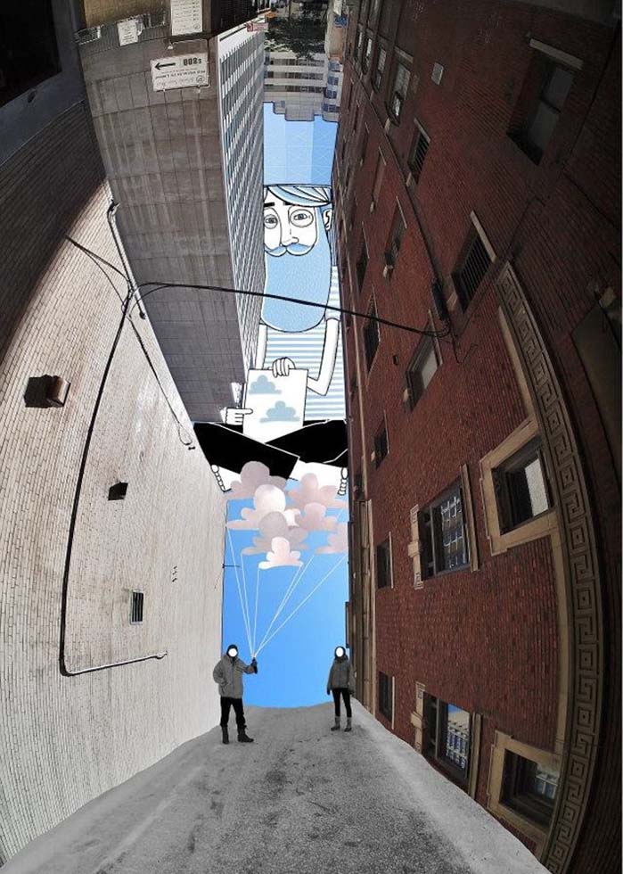 - Der französische Künstler Thomas interessiert sich für Fotos von städtischer Architektur. Anhand dieser Fotos hat er eine neue Art von Kunst geschaffen. Er malt also mit dem Himmel als Leinwand.