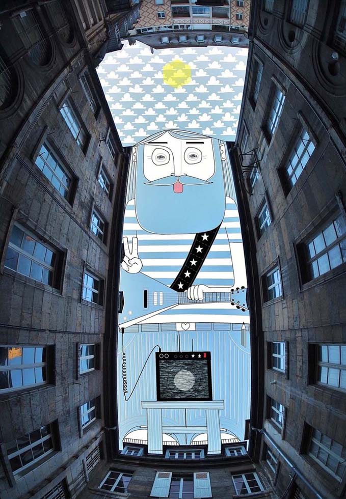 - Der französische Künstler Thomas interessiert sich für Fotos von städtischer Architektur. Anhand dieser Fotos hat er eine neue Art von Kunst geschaffen. Er malt also mit dem Himmel als Leinwand.
