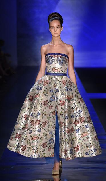 Ein Model zeigt am 13. Juli 2015 im Mailand, Italien, ein Kleid, das aus Yunjin Stoffen hergestellt wurde. Es wurde vom Modedesigner Lawrence Xu entworfen.