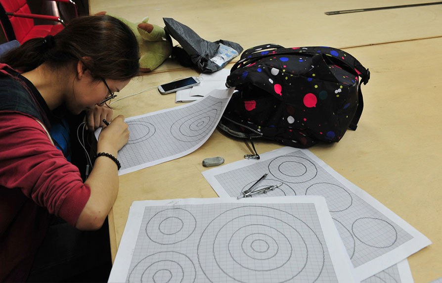 Eine Studentin übt das Zeichnen von Kreisen, eine Grundfertigkeit zum Entwurf von Yunjin Brokat.