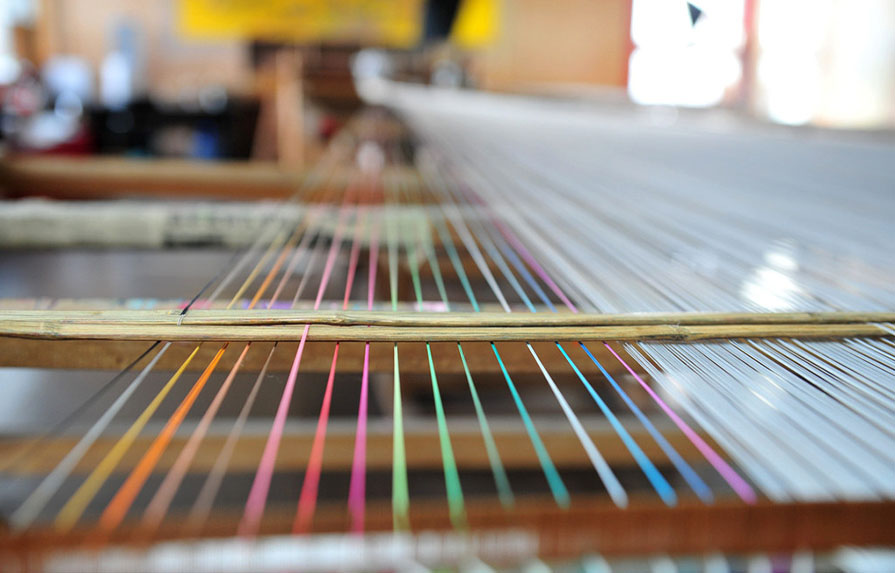 Tausende Seidefäden in einem Webstuhl zum Weben von Brokat.