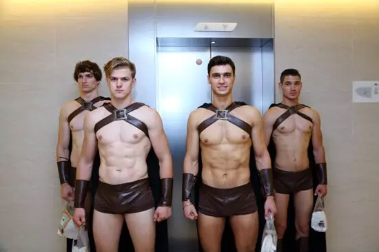 Auf den Fotos sieht man Dutzende ausländische Männer, die nur in Short und Umhang gekleidet, den griechischen Kämpfer "Spartacus" aus der Antike mimten.