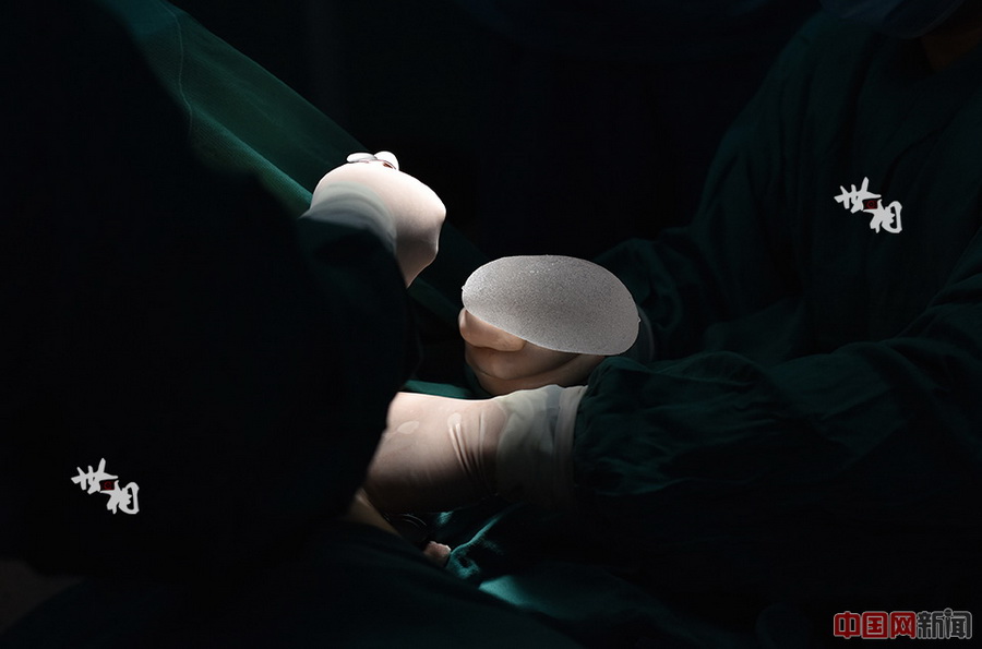 Der Füllstoff in Wang Qis Busen besteht aus importiertem Kieselgel. Der Arzt kneift die Prothese mit zwei Fingern und stopft sie langsam durch den Einschnitt in den Brustkorb hinein.