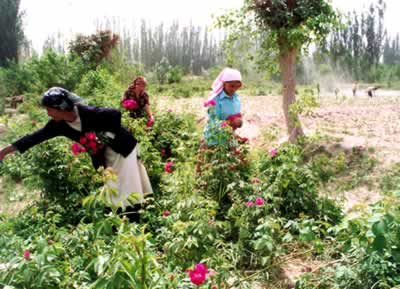 Uigurische Frauen pfl¨¹cken Rosen.