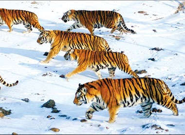 Das Archivfoto zeigt Raubkatzen, die durch den schneebedeckten Park für sibirische Tiger in Harbin in der Provinz Heilongjiang ziehen (Foto: Cina Daily).